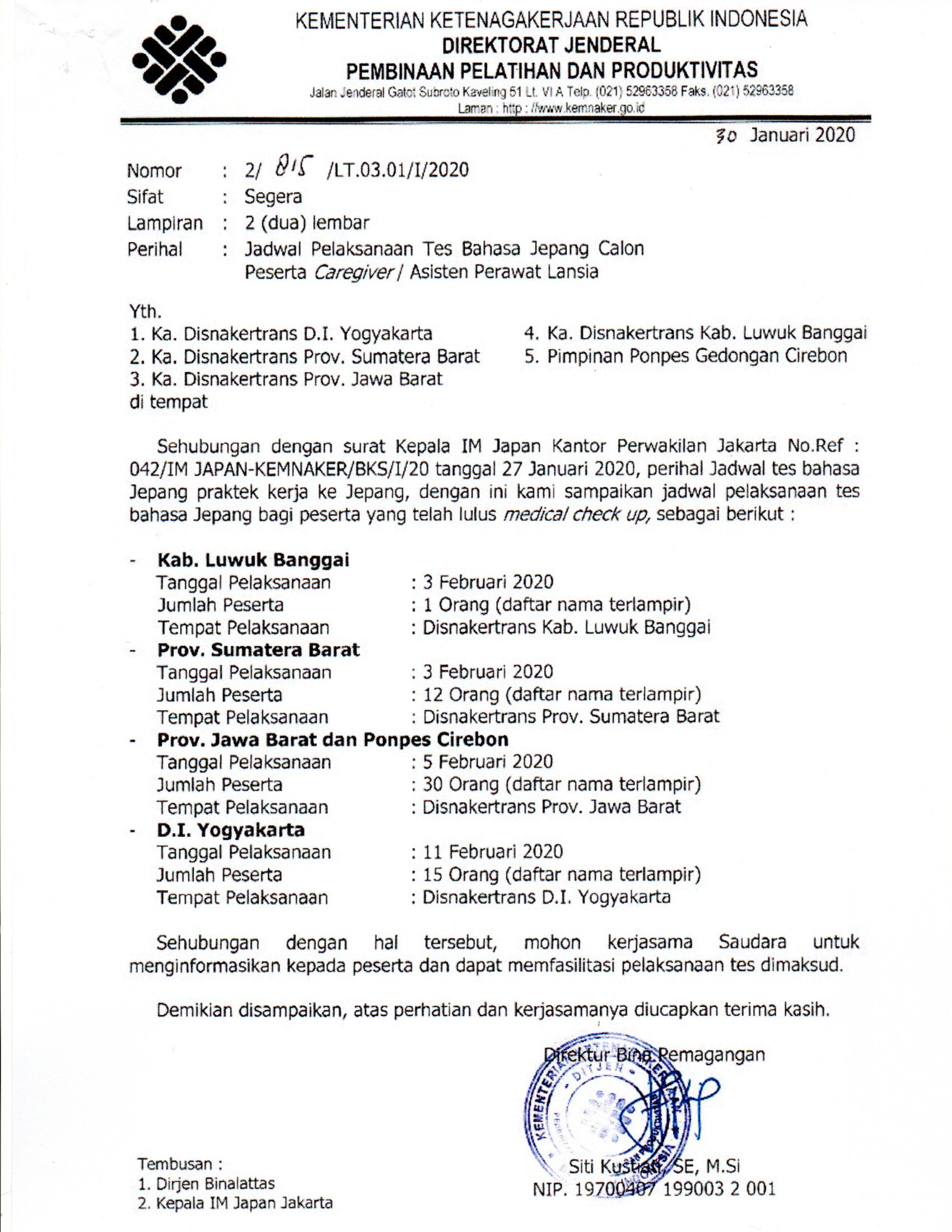 Jadwal Pelaksanaan Tes Bahasa Jepang Calon Peserta Caregiver untuk D.I.Yogyakarta, Prov. Sumatera Barat, Prov. Jawa Barat, Kab. Luwuk Banggai, dan Ponpes Gedongan Cirebon