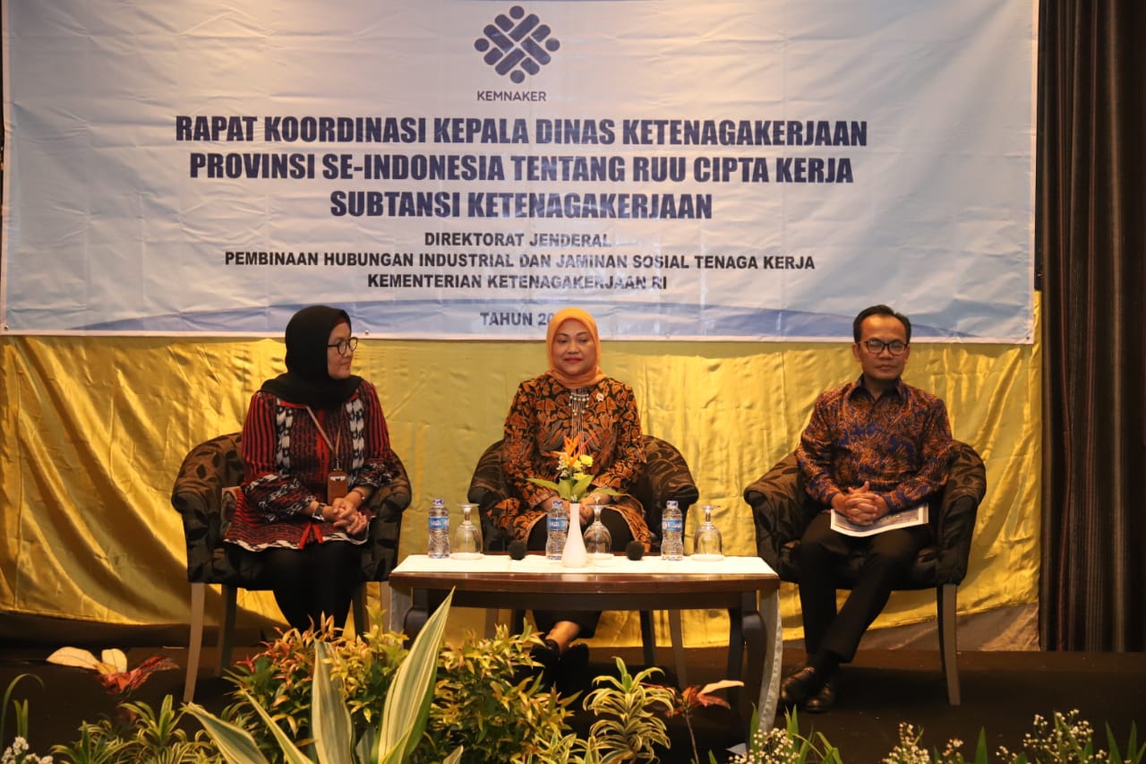 Rapat Koordinasi Kepala Dinas Ketenagakerjaan se Indonesia dihadiri oleh Menteri Tenaga Kerja Ida Fauziah dan Sesmen Kemenko Ekonomi Susiwijono Moegiarso, menekankan peranan penting dan proses yang sedang berlangsung untuk penyempurnaan substansi Ketenagakerjaan dalam RUU CIPTA KERJA