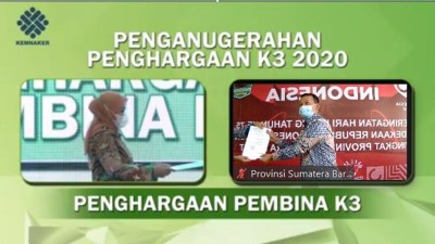 Penganugerahan Penghargaan K3 Tahun 2020 dan Gubernur Sumatera Barat menerima penghargaan sebagai Pembina K3 Tahun 2020 dalam hal ini diwakili oleh Kepala Dinas Tenaga Kerja dan Transmigrasi Provinsi Sumatera Barat yang diserahkan oleh Menteri Ket.