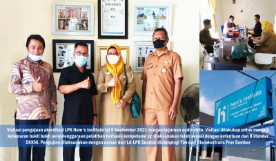 Visitasi pengajuan akreditasi LPK Hem's Institute tgl 6 September 2021 dengan kejuruan audio vidio. Visitasi dilakukan untuk menguji kebenaran bukti bukti penyelenggaraan pelatihan berbasis kompetensi yg dilaksanakan telah sesuai dengan ketent.
