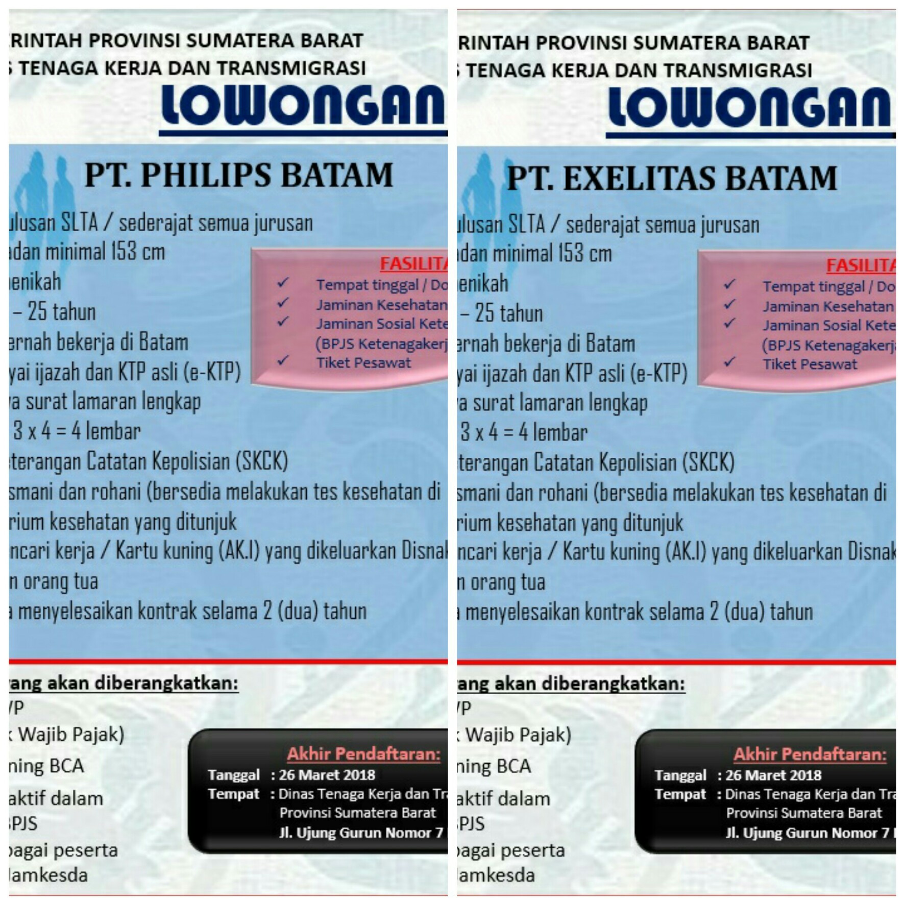 Informasi lengkap silahkan datangi langsung Disnakertrans Prov. Sumbar, Jl. Ujung Gurun No. 7 Padang atau Dinas yang membidangi ketenagakerjaan kab/kota setempat.
