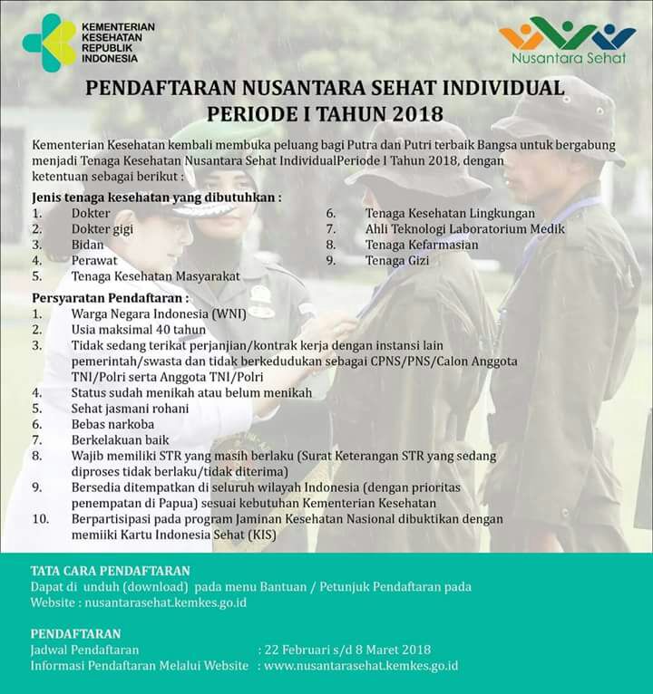Kementerian Kesehatan kembali membuka peluang bagi Putra dan Putri terbaik Bangsa untuk bergabung menjadi Tenaga Kesehatan Nusantara Sehat IndividualPeriode I Tahun 2018, dengan ketentuan sebagai berikut :