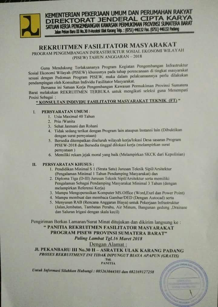 Lowongan Kerja Konsultan Individu Fasilitator Masyarakat Tekhnik (FT)