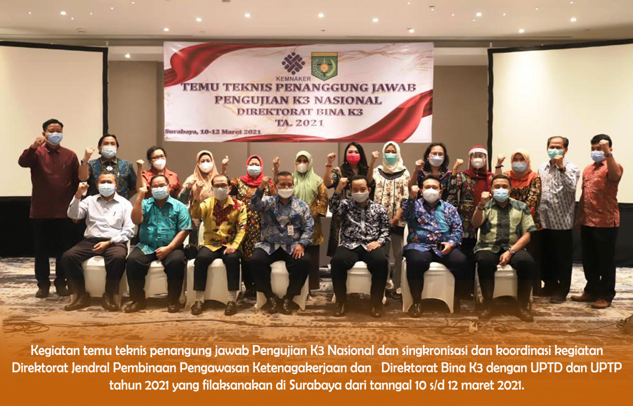 Kegiatan temu teknis penangung jawab Pengujian K3 Nasional dan singkronisasi dan koordinasi kegiatan Direktorat Jendral Pembinaan Pengawasan Ketenagakerjaan dan Direktorat Bina K3 dengan UPTD dan UPTP tahun 2021 yang filaksanakan di Surabaya dari tanngal 10 s/d 12 maret 2021.