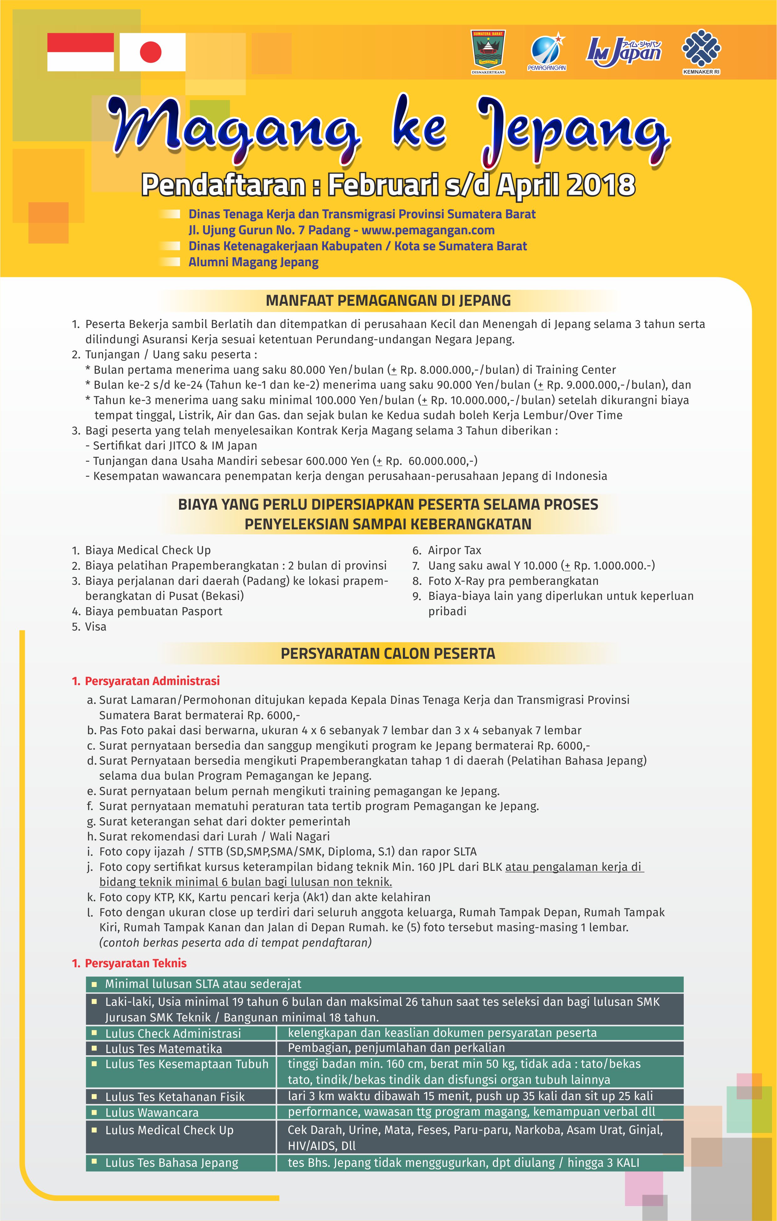 Dinas Tenaga Kerja dan Transmigrasi (Disnakertrans) Prov. Sumatera Barat membuka peluang bagi calon tenaga kerja di Sumbar untuk magang ke Jepang. Magang ini akan berlangsung hingga tiga tahun.