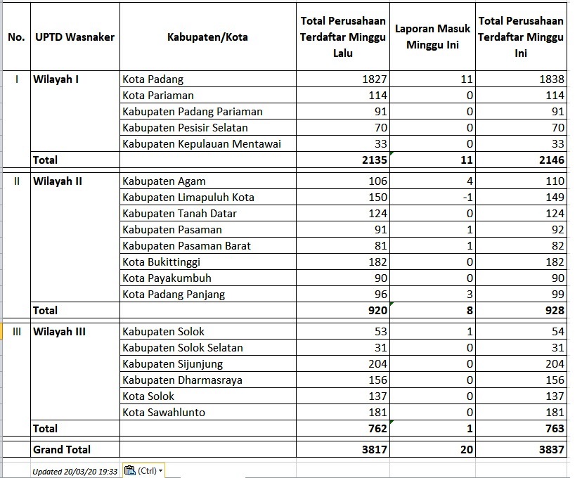 Daftar Perusahaan Kab/Kota yang terdaftar dan laporan masuk minggu lalu.